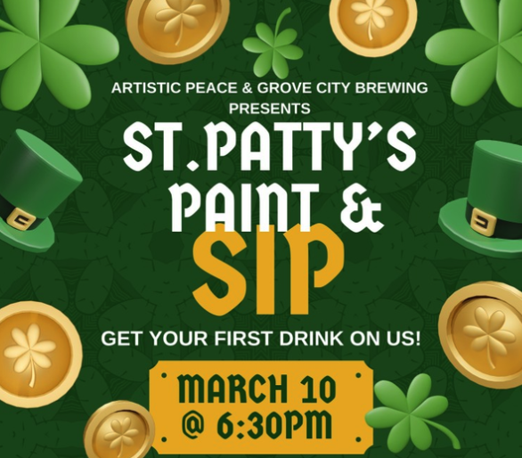 Get ready to paint and sip your way through a fun-filled evening celebrating St. Patty’s Day! Join us in person for a relaxed vibe, great company, and plenty of creativity. Whether you’re a pro or just want to have some laughs, this event is perfect for anyone looking to unwind and unleash their inner artist. Grab your friends and come make some colorful memories!